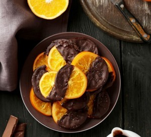 Candied orange slices dipped in rich, dark chocolate