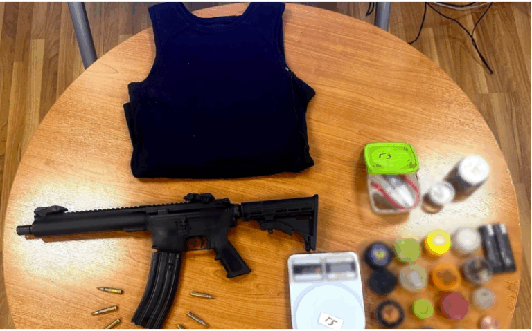 The suspects were found in possession of a military-style rifle, cocaine, cannabis, and seals bearing insignia of Public Services