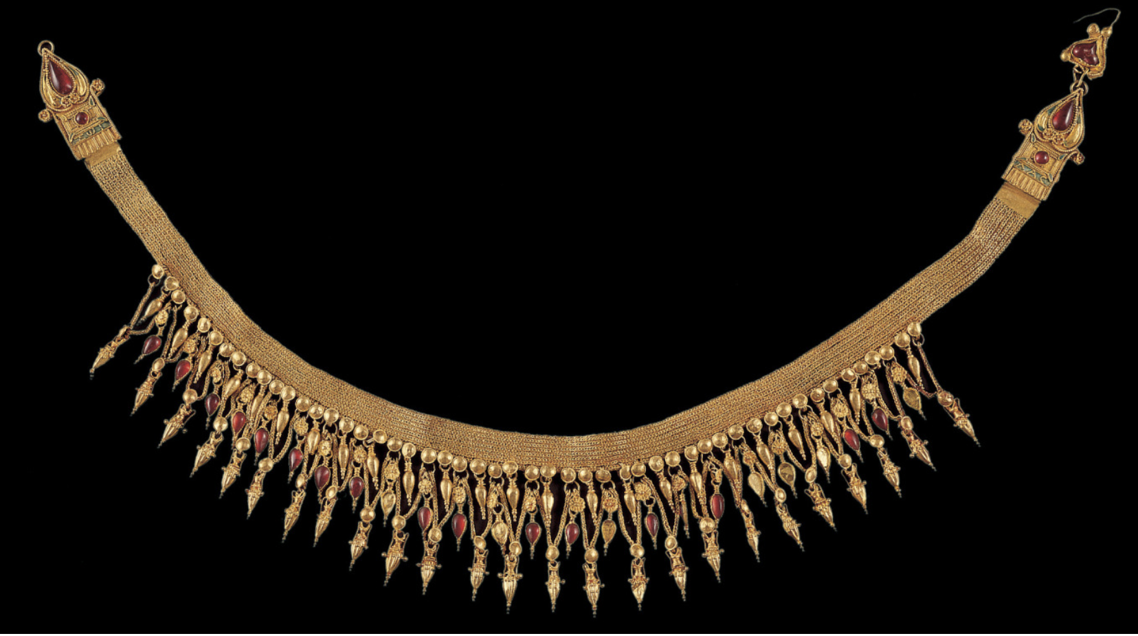 The exhibition features necklaces, sculpted rings, earrings, pins, and tools from the Hellenistic goldsmithing tradition