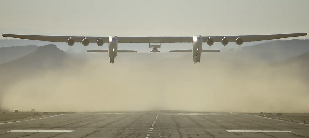 Sporting two side-by-side fuselages, six Boeing 747 engines, 28 wheels & wings that stretch 117m from tip to tip the Roc is the world's largest aircraft by wingspan