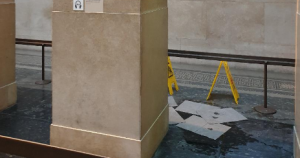 The floor on that spot was covered in absorbing cloth and yellow signs warned about the slippery floor