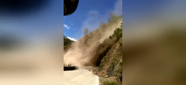 Terrifying moment bus passengers scream after getting stuck yards from landslide (video)